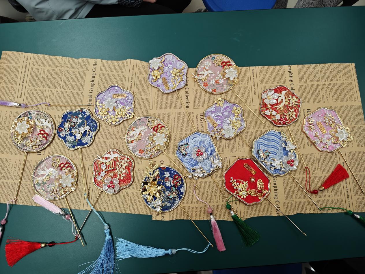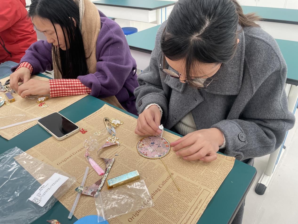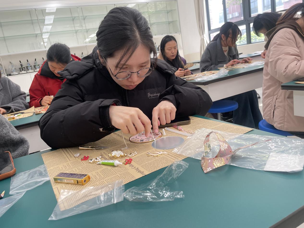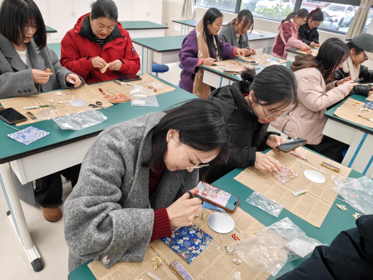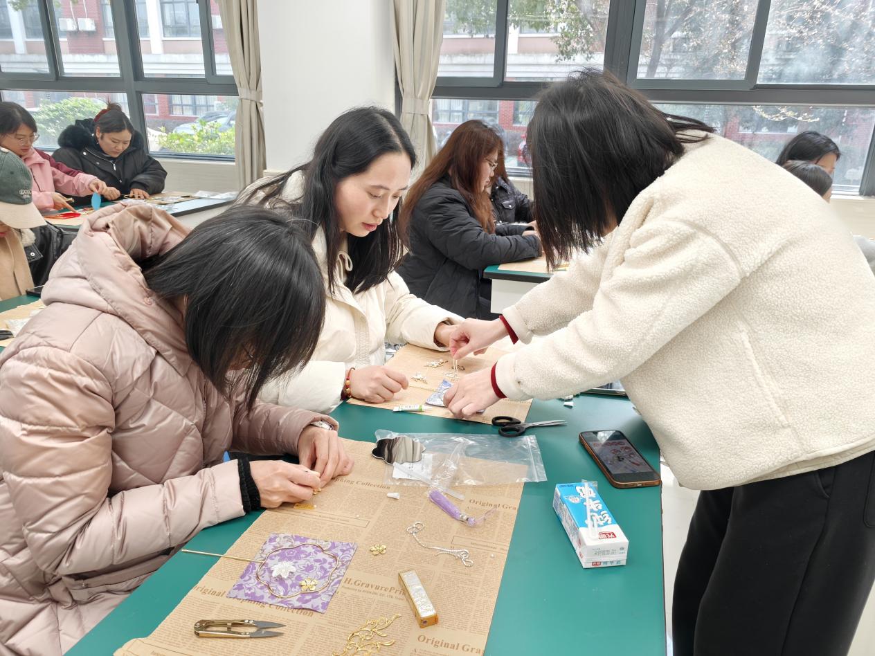 活动现场,老师们围坐在一起,在手工老师的细致指导下,拿起织锦面料、金属花片、珍珠饰件等材料,一步步开始创作。从织锦纹样的搭配,到金属饰件的粘贴,再到珍珠边缘的点缀,大家耐心钻研、相互交流,指尖流转间,将传统织锦工艺与现代审美巧妙融合。原本普通的镜面小团扇,在老师们的巧手下逐渐变得精致灵动:蓝底云纹款清雅飘逸,红底繁花款热烈典雅,绿底梅枝款温婉含蓄,每一把都承载着独特的匠心与巧思,既是实用的化妆镜,也是充满东方韵味的艺术品。